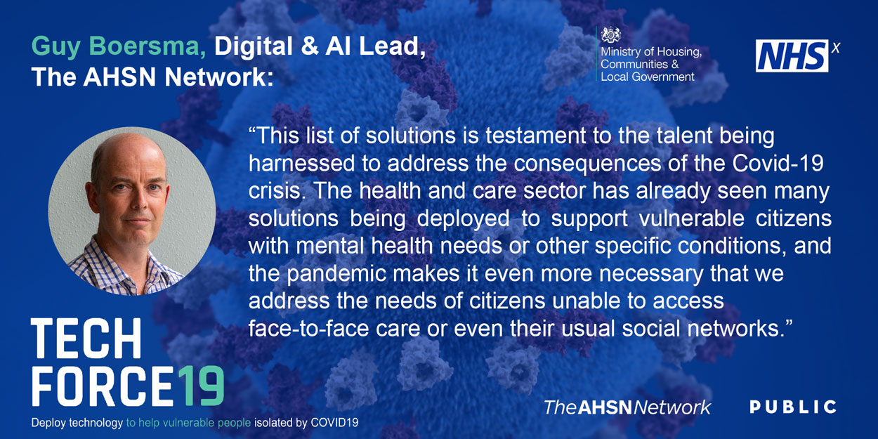 Guy Boersma, Digital and AI Lead, The AHSN Network, said: "This list of solutions is testament to the talent being harnessed to address the consequences of the COVID-19 crisis. The health and care sector has already seen many solutions being deployed to support vulnerable citizens with mental health needs or other specific conditions, and the pandemic makes it even more necessary that we address the needs of citizens unable to access face-to-face care or even their usual social networks.