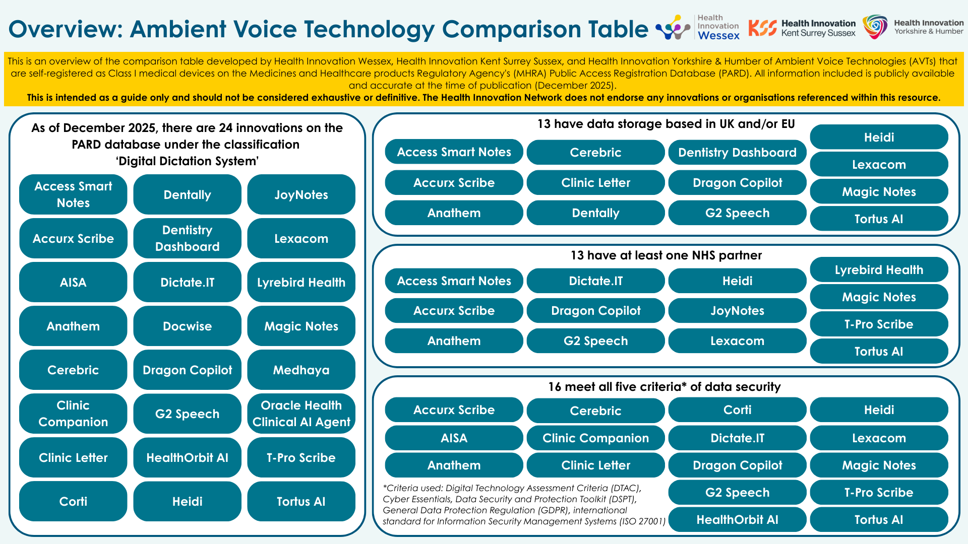 To assist health and social care organisations in their search for the right AVT, Health Innovation Wessex, Health Innovation Kent Surrey Sussex, and Health Innovation Yorkshire and Humber have created an AVT comparison table that gives some basic information about all AVTs that are currently on the MHRA PARD and are all (self) certified Class I medical devices.
